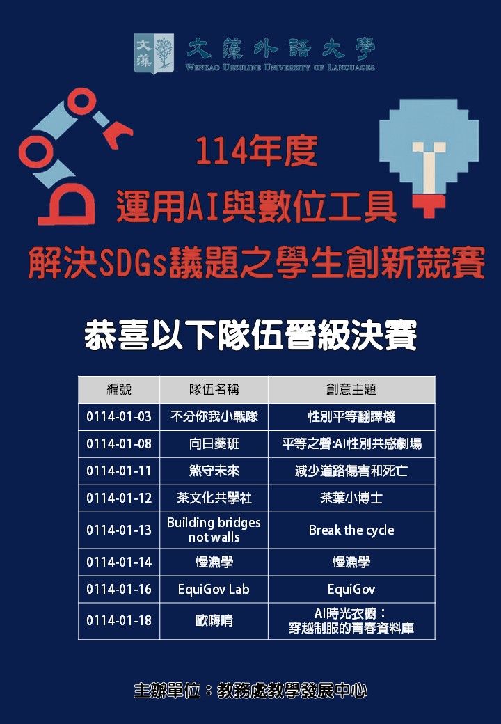 - 獲選入圍決賽團隊,請於114年11月23日(日)23:59前,由該團隊隊長上傳以下資料至ctld@mail.wzu.edu.tw: